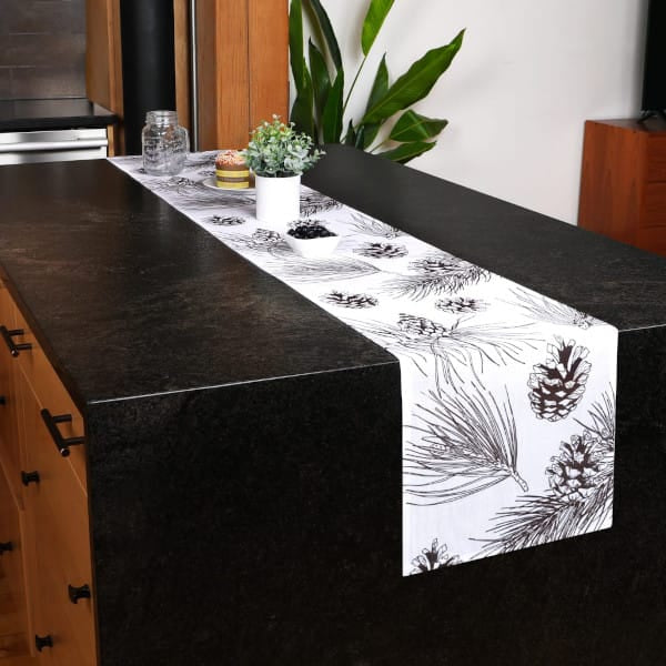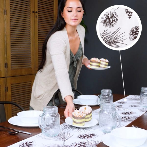 • Featuring beautiful dark brown woodland pinecone print on an elegant brilliant white you’ll enhance any event, party or gathering with this woodsy pine fir branch print table runner.