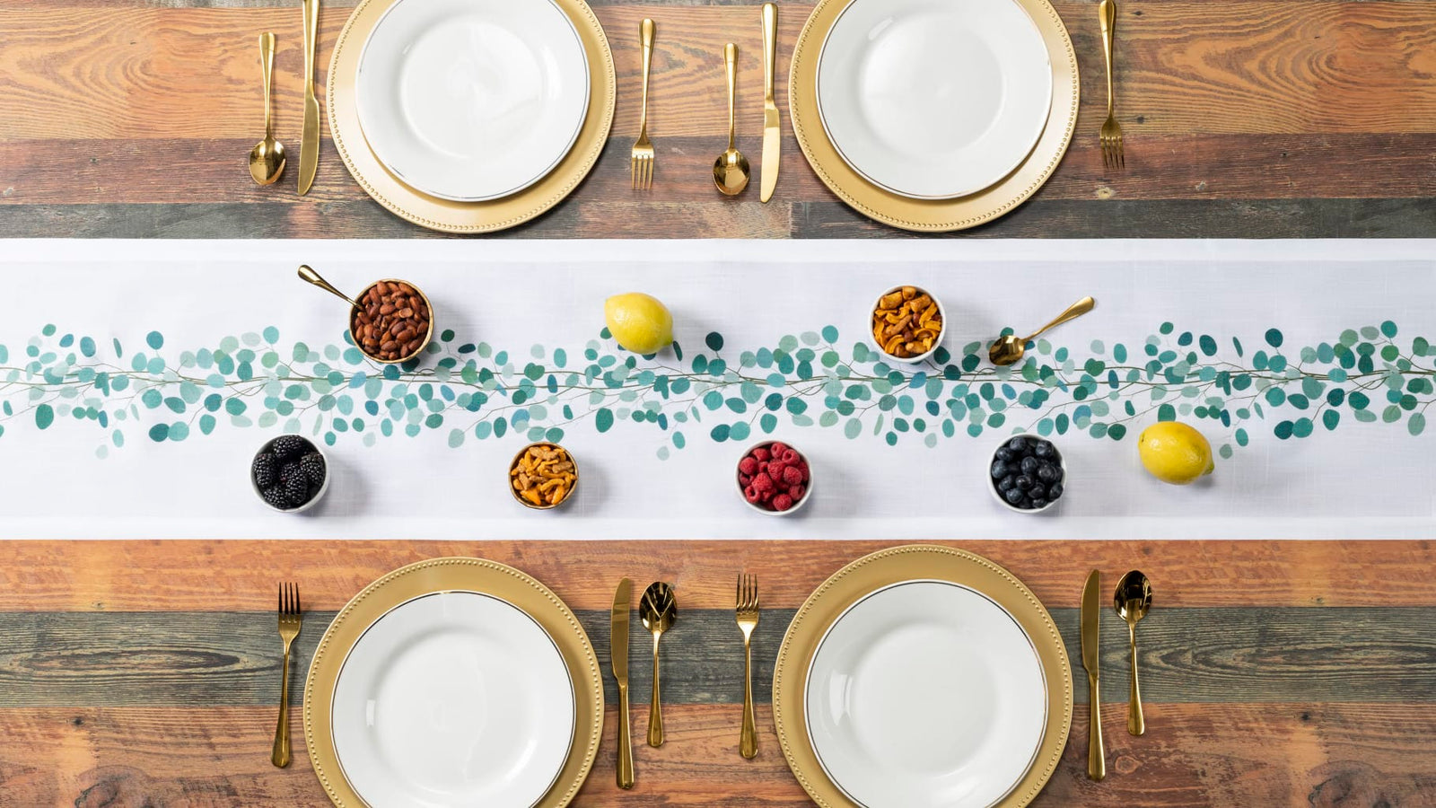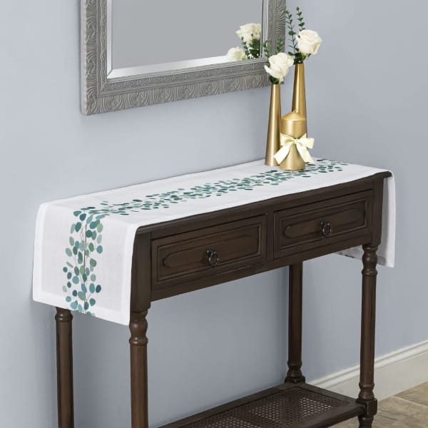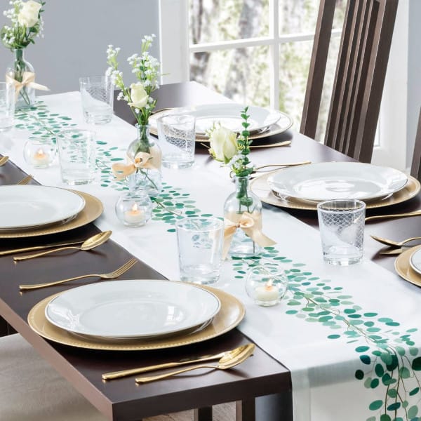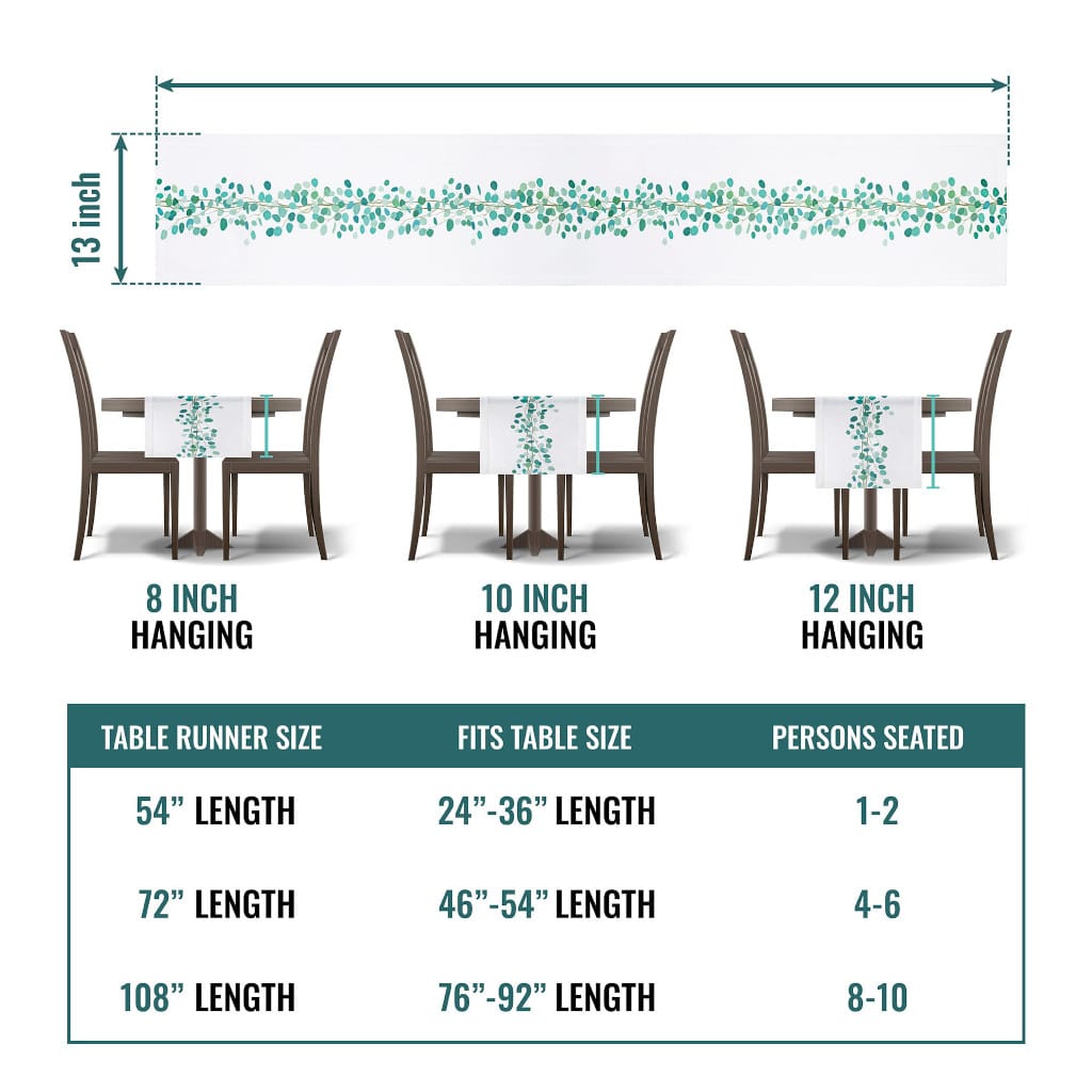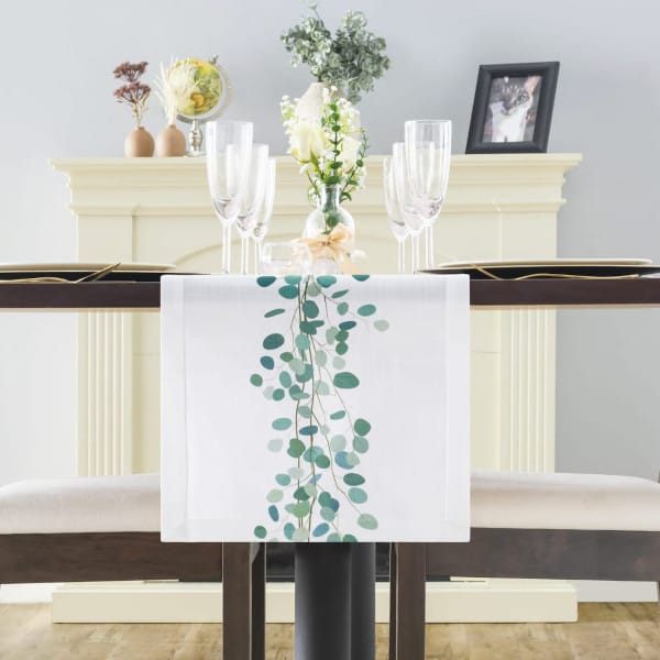 • Featuring beautiful green eucalyptus garland print down the center of elegant bright white fabric you’ll enhance any event, party or gathering with this elegant modern eucalyptus leaves table runner.