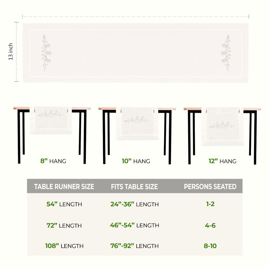 • This table runner is 13 wide, and available in three classic sizes 54", 72" and 108" lengths. When purchasing embroideries consider the hang down for each side. See Our Sizing Guide Above To Learn More