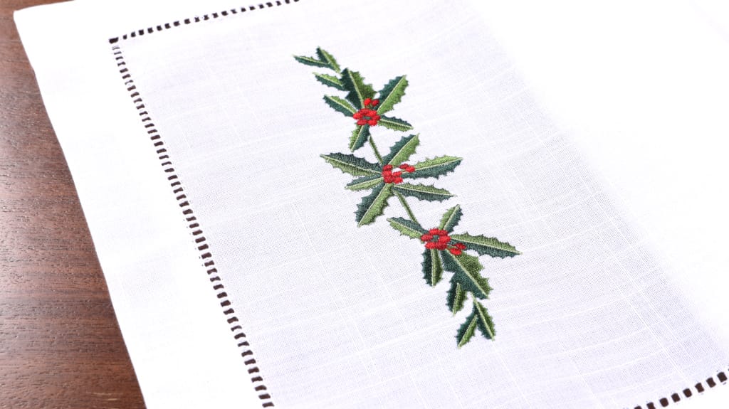 Featuring a stunning red and green holly berry embroidery and hemstitch borders for an elegant, yet rustic farmhouse look that creates warmth and ambiance.